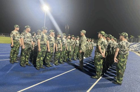 晚上7点,试验区体育场内,教官对三个方队的学员进行排列、军训纪律教育。