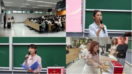 选举环节分为两个阶段,第一阶段为团员大会,团委委员候选人依次进行竞选演讲,全体团员投票选举出13名团委委员;第二阶段为全体学生大会,学生会委员候选人依次进行竞选演讲,全体学生投票选举出15名学生会委员。