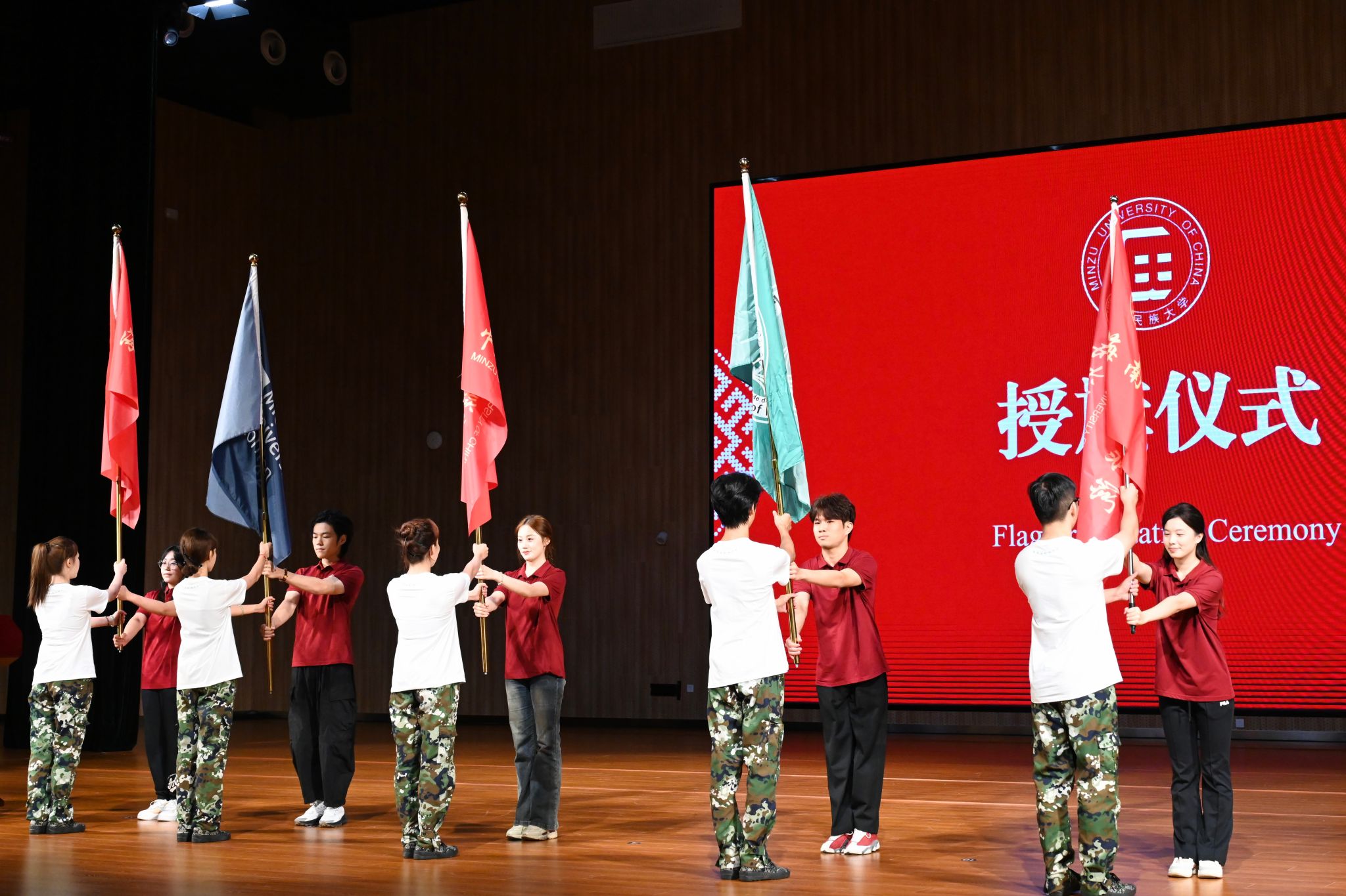 在庄重的授旗仪式环节,老生代表将BETWAY必威、英国密德萨斯大学、澳门城市大学三校校旗以及必威西汉姆联院旗郑重传递给新生代表,象征着学术精神的传承与使命担当的延续。
