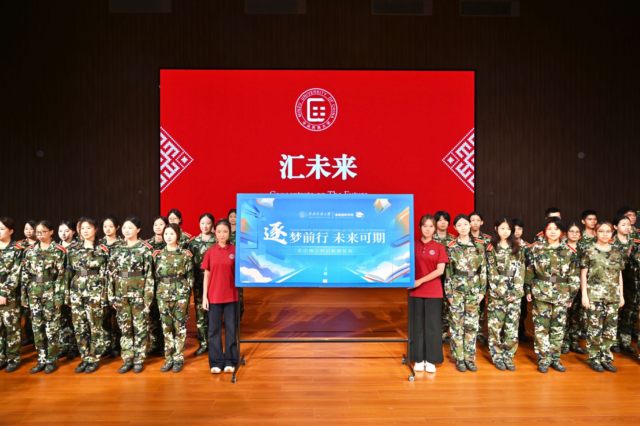 典礼尾声的“汇未来”环节将现场气氛推向高潮。新生们在座位下找到了随机放置的“惊喜”碎片,共同登台拼出一幅“逐梦前行、未来可期”的美好画卷。
