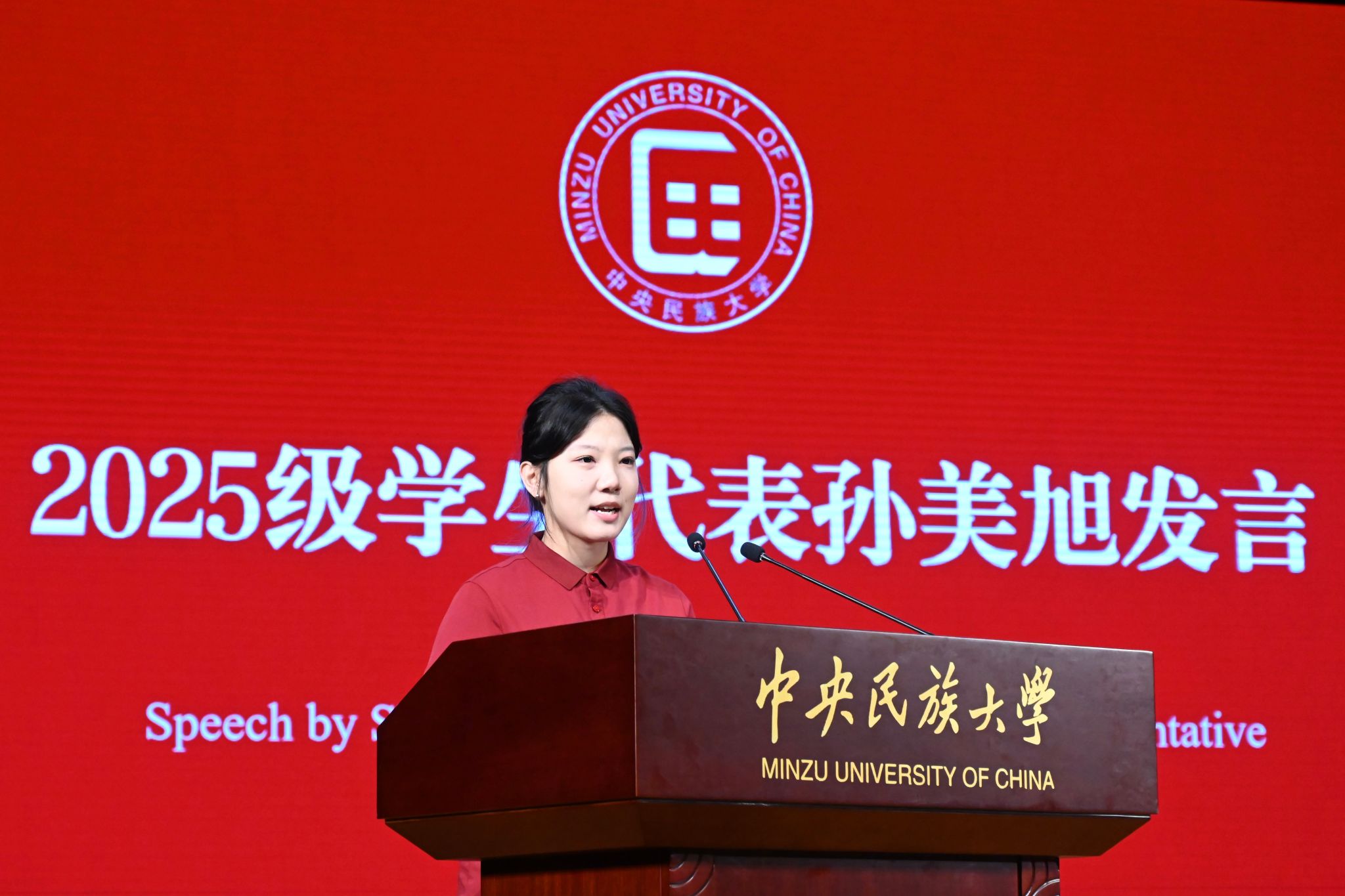 2025级新生代表、音乐学专业孙美旭在发言中表达了对大学生活的憧憬与决心。她表示,将珍惜学院提供的多元文化沃土,深入传统、融合现代,以音乐为媒传播中华文化,肩负起新时代青年的使命。