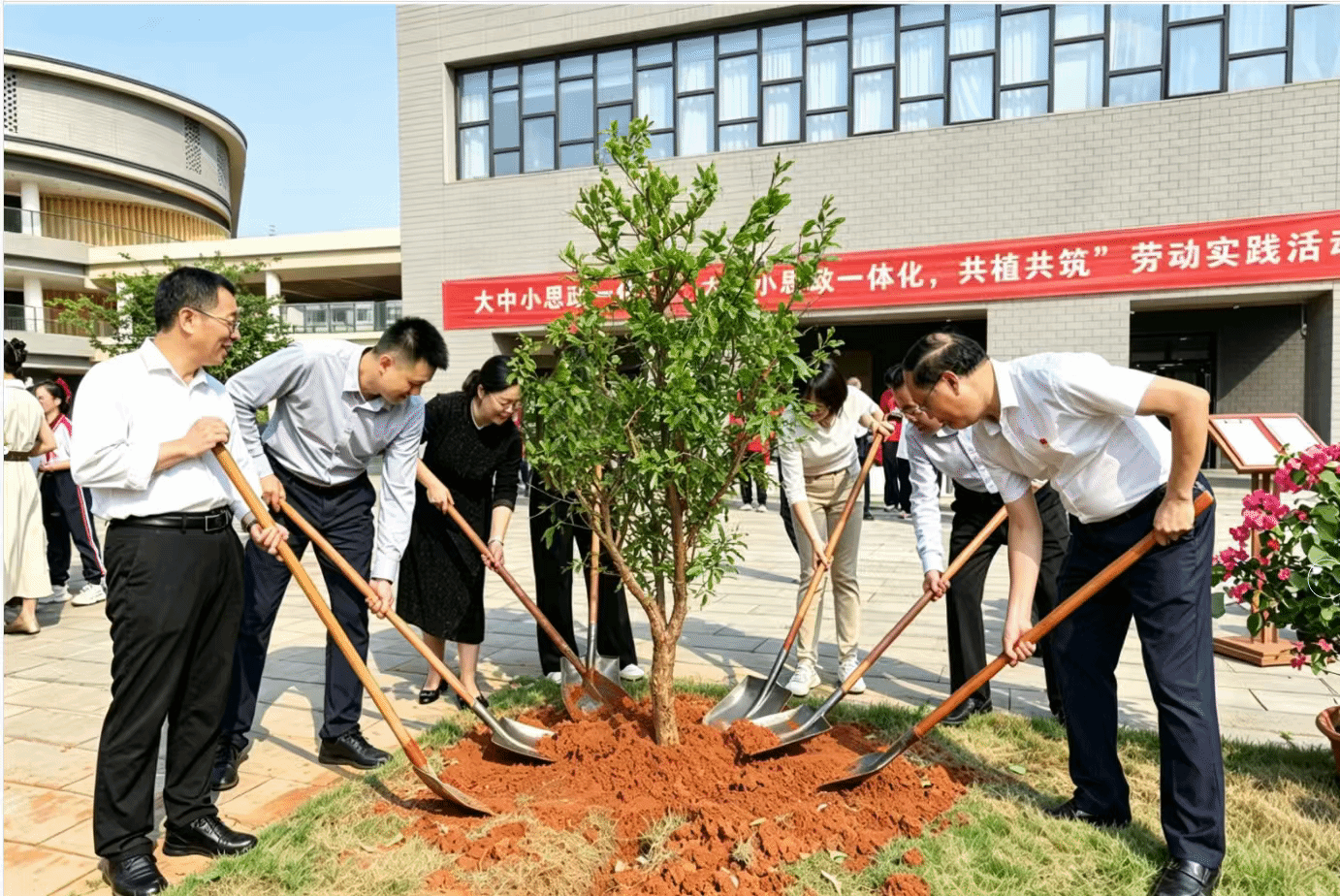 “劳动不是课本里抽象的概念,而是今天你们手中每一次挥锹、每一次培土、每一次浇灌。”大学生挥锹挖坑,中学生扶苗培土,小学生提水浇灌——不同年龄的双手握在同一把铁锹上,不同学段的心跳在同一个节奏里共振。同学们在亲手劳作中,不仅体验到了耕耘的辛劳,更感受到了生命的成长与责任的重量。每一滴汗水都在诉说着“一分耕耘,一分收获”的朴素道理,每一次协作都在传递着“团结互助,共筑美好”的深刻内涵。劳动,就这样以最直观、最生动的方式,将书本上的道理融入日常。