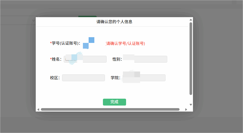 绑定成功后,重点核对学号、姓名、性别、学院(和专业名称一致即可)。校区如未显示请忽略。如果有错误,请联系班级学习委员,由学习委员统一反馈给教务老师。