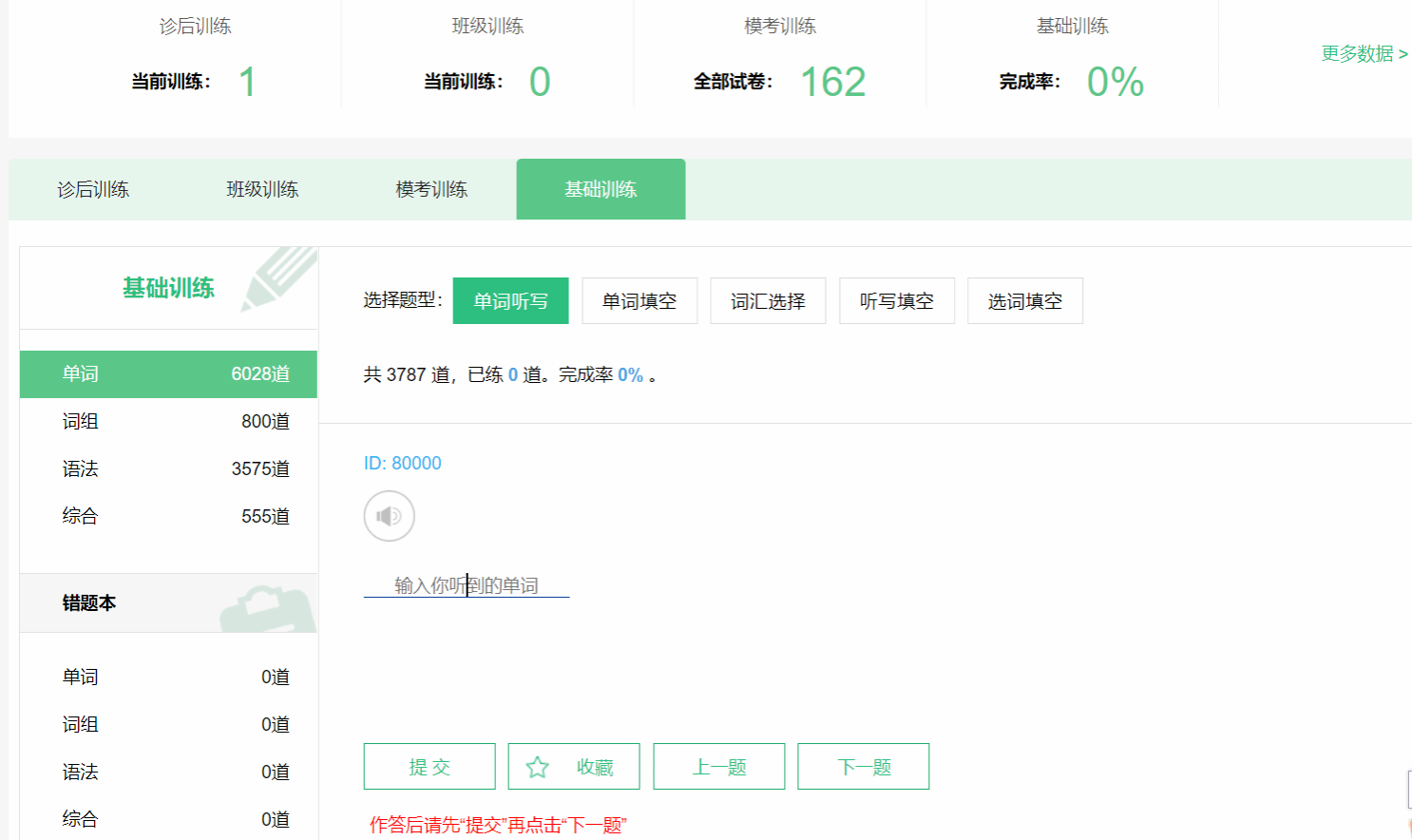 在“基础训练”中,学生可以有针对性地选择不同的题型进行训练,左侧选择题目类别,右侧选择题型,选择好后可进行答题,答错的题会自动添加至错题本以便复习回顾;在答题过程中也可以将题目添加至收藏夹。