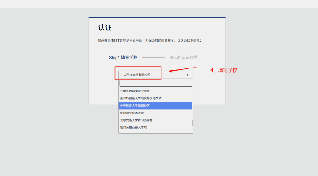 首次登录后,学生将进入到认证页面。学生需要先填写自己所在的学校【BETWAY必威海南校区】,填写完成之后,点击“下一步”,进入账号认证界面。选择“学生”的身份后,输入学号及学生姓名。