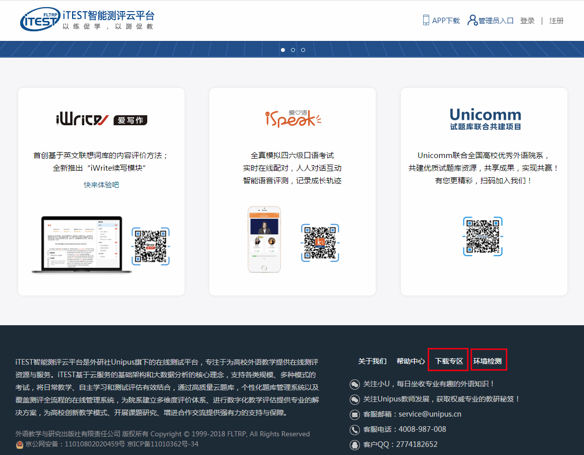 在正式使用ITEST智能测评云平台(https://itestcloud.unipus.cn/)之前,学生需要确保所使用的浏览器等符合系统的要求,否则可能会影响学生的使用体验。系统推荐使用360极速浏览器、谷歌(Chrome)浏览器、火狐(Firefox)浏览器,学生若不清楚自己所使用的浏览器或相关配置是否符合要求,可以点击首页右下角的“环境检测”对浏览器、网速等情况进行检测。若检测后发现配置不符合推荐要求,系统会提醒学生前往“下载专区”进行下载。