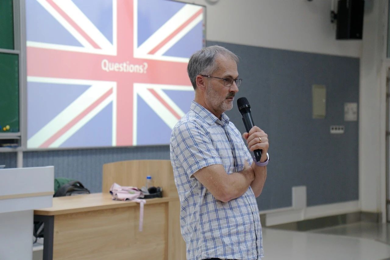 讲座中,Allen结合自己近二十年在中国的生活经历,用幽默的语言和独特的双重视角,为我们揭开英国风土人情的神秘面纱。他首先以一系列趣味盎然的测试与同学们进行了互动,点燃了现场的气氛。这巧妙地打破了大家对于英国的刻板印象,展现了英国文化的多样性与包容性。Allen还分享了许多个人经历和文化趣事,使同学们在轻松愉快的氛围中对英国的生活习俗、节日庆典及饮食文化有了初步的了解。此外,讲座深入探讨了英国的地理特点,为中英文化的交流碰撞提供了新的视角。
