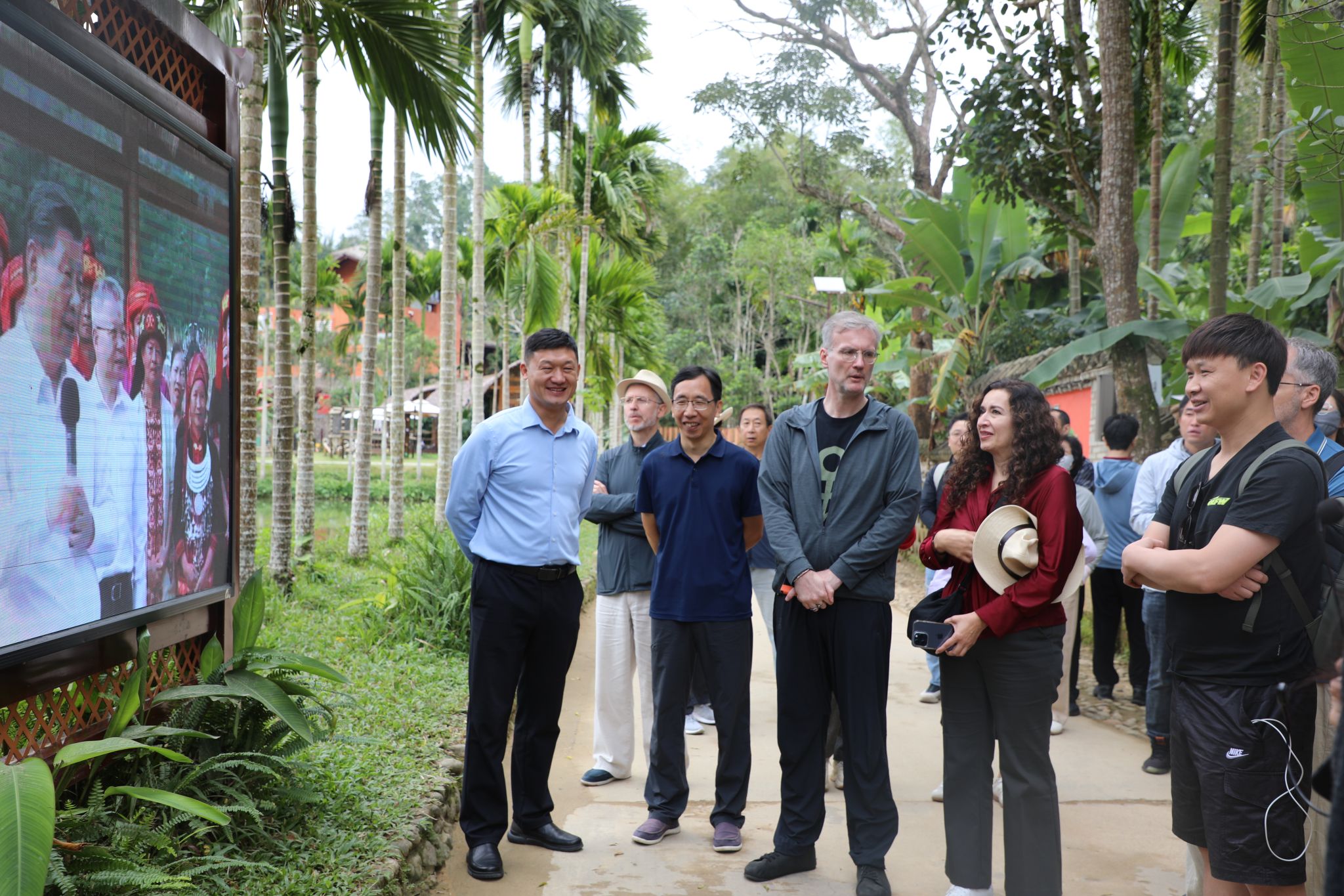 在毛纳村,同志们与外籍专家一道沿着总书记考察足迹,先后来到毛纳村宝山竹屋广场、和茹手工茶坊、硕果亭、共同广场等地,观看参与黎族舞蹈,品尝黎族特色美食,欣赏黎族传统纺染织绣技艺,了解种茶制茶技艺。在调研途中,同志们边走边看并与村民互动交流,了解毛纳村美丽乡村建设和乡村旅游业发展情况,并向外籍专家介绍了黎族优秀传统文化和风土人情。