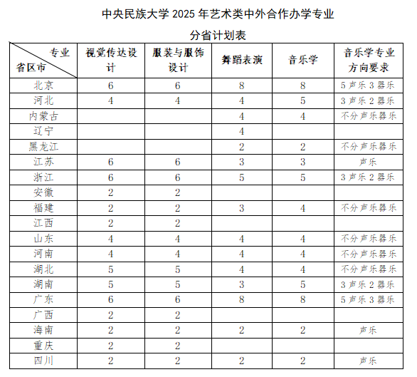 2025年计划在全国招收本科生240名,其中视觉传达设计、服装与服饰设计、舞蹈表演、音乐学四个专业各60名。分省计划如下表所示: